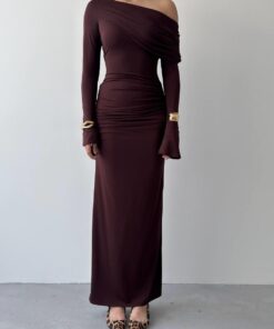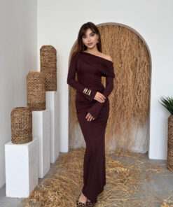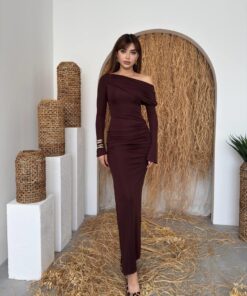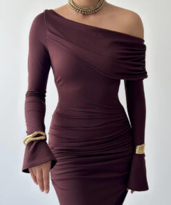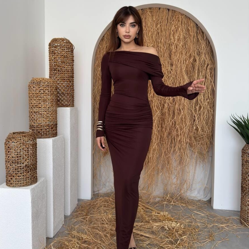 الفستان يظهر بنيأحمر أنيق مع قصة طويلة ضيقة (Bodycon) تبرز قوام الجسم، وقماش مطاطي مشدود مع كشكش جانبي. يتميز بكتف ساقط (One-Shoulder/Off-Shoulder) أقرب للـ Straplez مما يعطيه لمسة عصرية أنثوية.