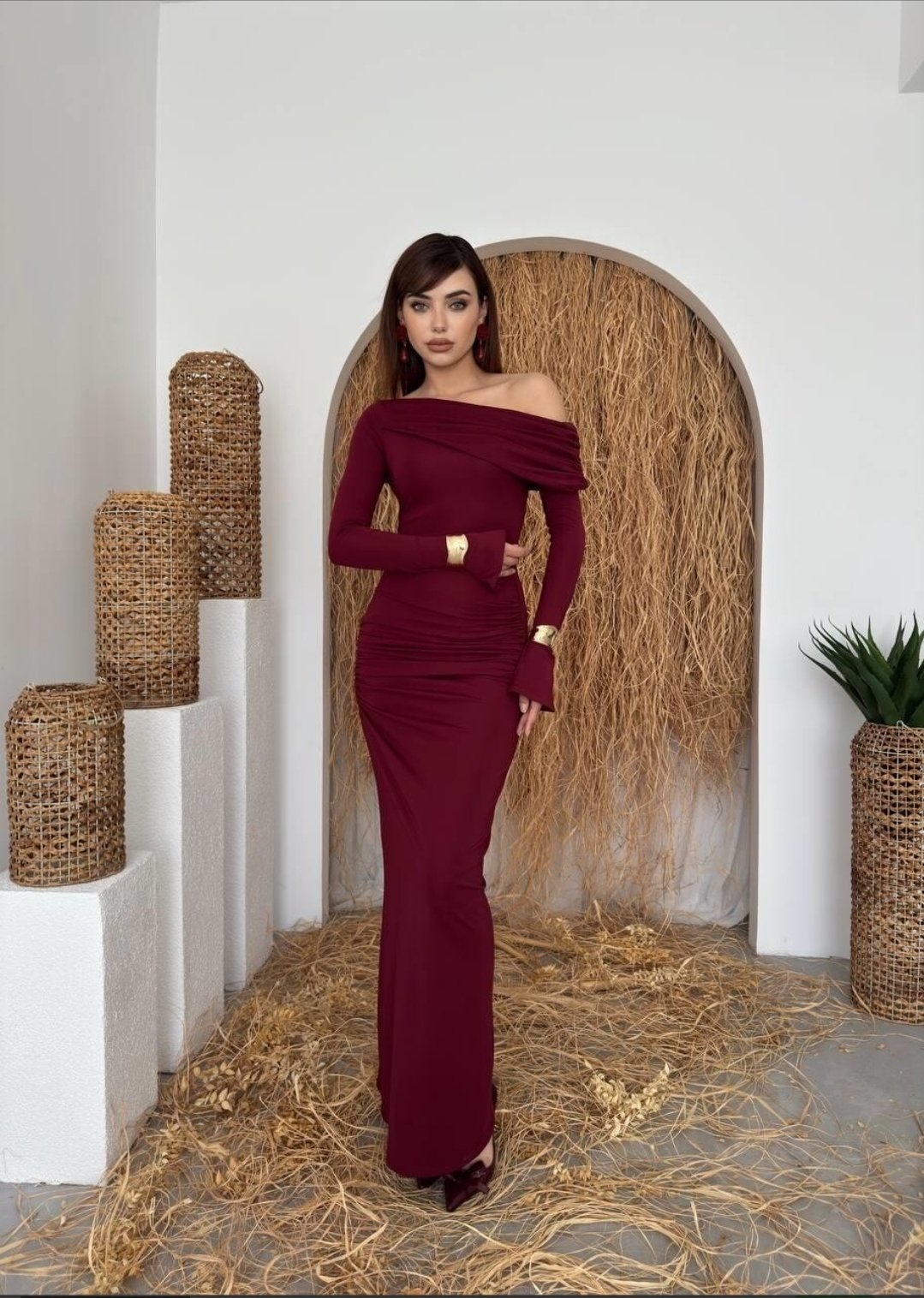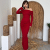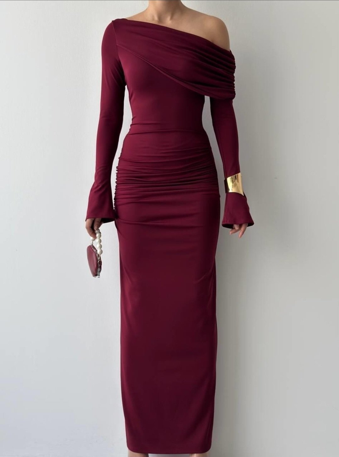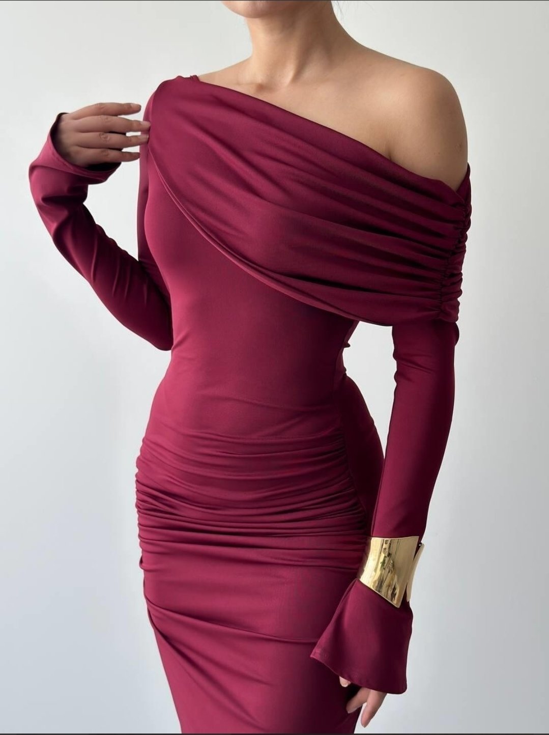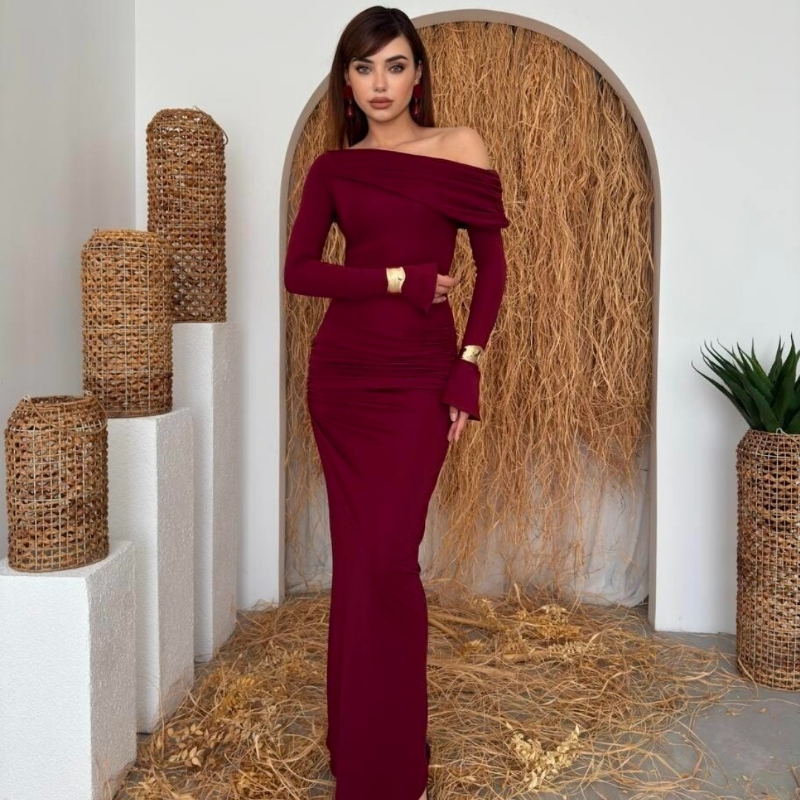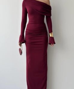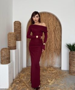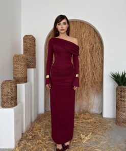 الفستان يظهر بلون خمري أنيق مع قصة طويلة ضيقة (Bodycon) تبرز قوام الجسم، وقماش مطاطي مشدود مع كشكش جانبي. يتميز بكتف ساقط (One-Shoulder/Off-Shoulder) أقرب للـ Straplez مما يعطيه لمسة عصرية أنثوية.