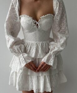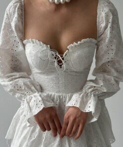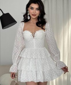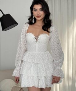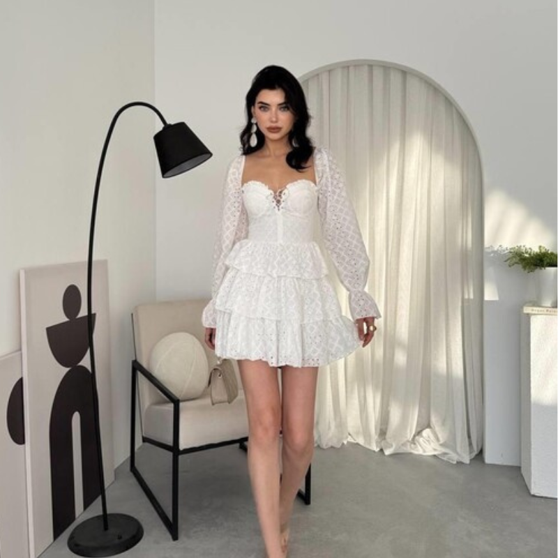 فستان أبيض قصير بتفاصيل أنثوية ناعمة، مصمم بقماش خفيف مزخرف بنقشة ناعمة وشفافة قليلاً. يميّزه تصميم الصدر على شكل كورسيه أنيق، مع أكمام طويلة شفافة وتنورة بطبقات كشكش تعطي حركة ولمسة playful. مثالي لإطلالات النهار، جلسات التصوير، أو المناسبات الخاصة اللي بدك فيها تظهري بطابع ناعم وجذاب.