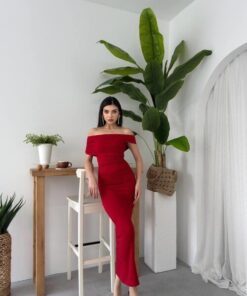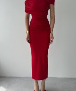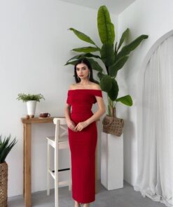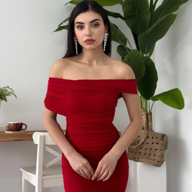 فستان أوف شولدر أنيق بلون أحمر جريء، يتميز بكسرات ناعمة على منطقة الصدر والخصر تعزز القوام وتضفي لمسة فاخرة. مصمم بقصة ضيقة وطول ميدي ليوفر إطلالة أنثوية ساحرة مثالية للمناسبات الخاصة والسهرات المميزة.