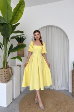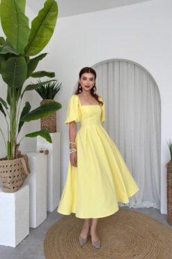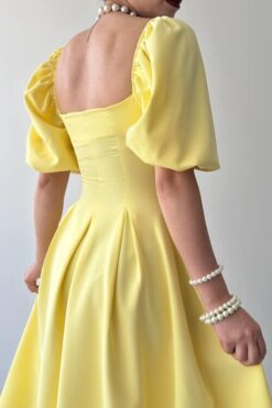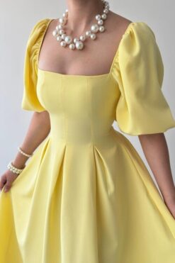 فستان ملكي أصفر بقصة كلوش وأكمام منفوشة💛