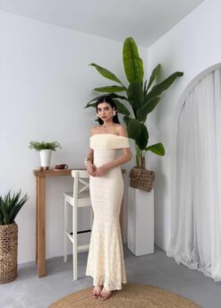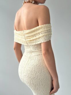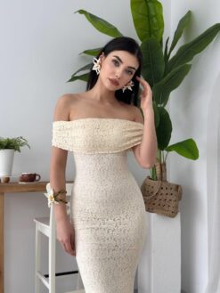 فستان بيج بكتف مكشوف وتصميم ضيّق يُبرز القوام، مصنوع من دانتيل فاخر تضيف لمسة درامية أنثوية. مثالي للسهرات والمناسبات الخاصة بإطلالة جريئة وأنيقة.