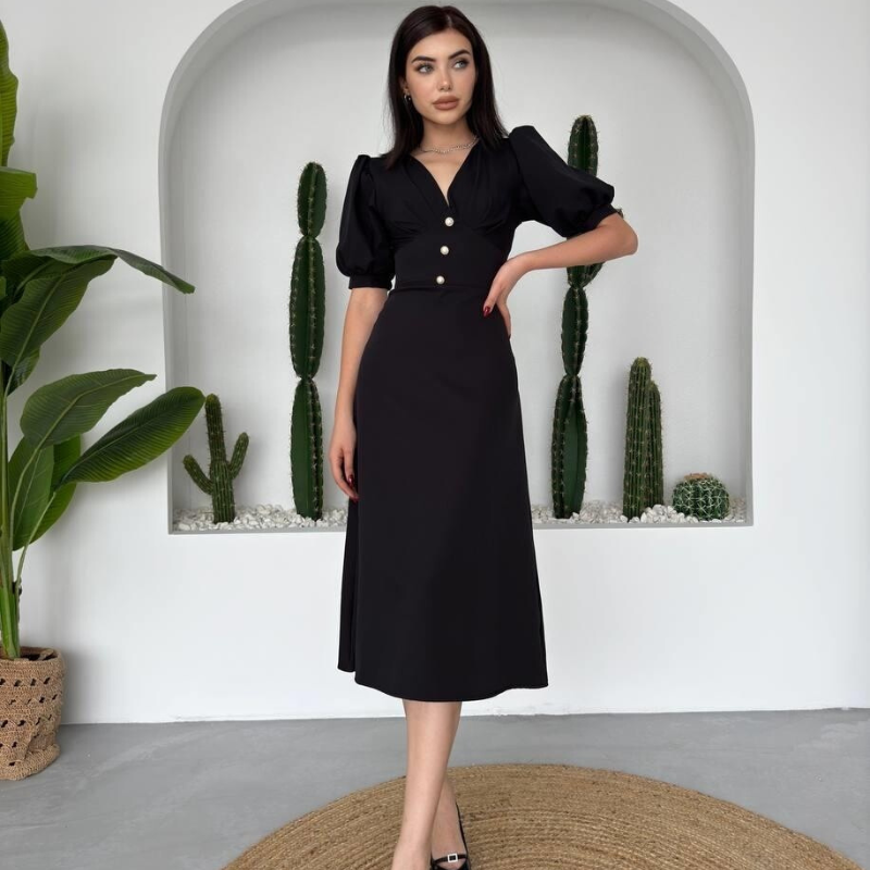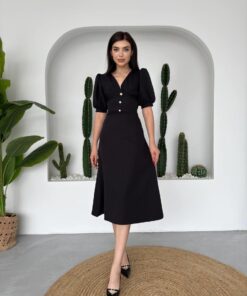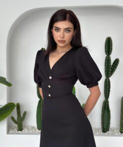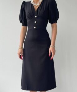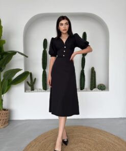 فستان أسود أنيق بطول متوسط وتصميم كلاسيكي. يتميز بأكمام منتفخة قصيرة وأزرار أمامية تضفي لمسة أنيقة. الفستان بقصة مريحة وينساب بنعومة على الجسم، مما يجعله مثاليًا لمختلف المناسبات.