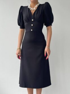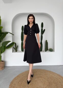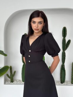 فستان أسود أنيق بطول متوسط وتصميم كلاسيكي. يتميز بأكمام منتفخة قصيرة وأزرار أمامية تضفي لمسة أنيقة. الفستان بقصة مريحة وينساب بنعومة على الجسم، مما يجعله مثاليًا لمختلف المناسبات.