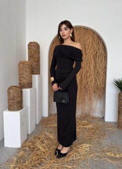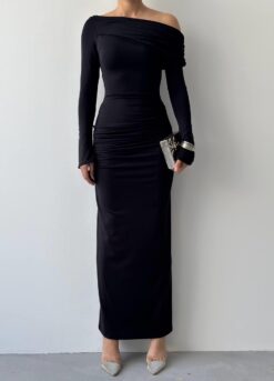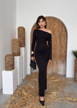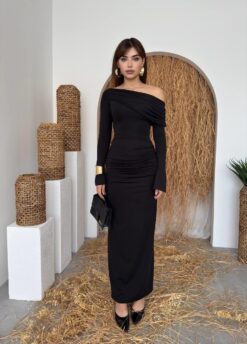 الفستان يظهر بلون أسود أنيق مع قصة طويلة ضيقة (Bodycon) تبرز قوام الجسم، وقماش مطاطي مشدود مع كشكش جانبي. يتميز بكتف ساقط (One-Shoulder/Off-Shoulder) أقرب للـ Straplez مما يعطيه لمسة عصرية أنثوية.