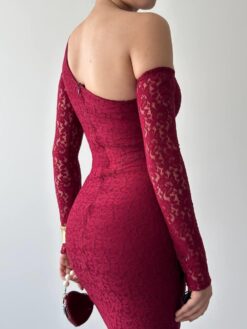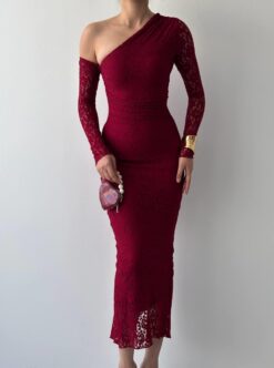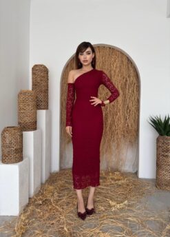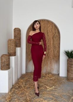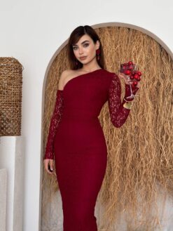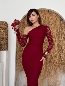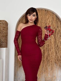 فستان أنيق مصمَّم من قماش الدانتيل الفاخر بلون خمري ، يتميّز بقصّة ميدي ضيّقة تبرز جمال القوام. تصميم الكتف الواحد مع كم طويل من الدانتيل الشفاف يضيف لمسة أنثوية راقية تجمع بين البساطة والجاذبية. خيار مثالي للمناسبات الخاصة، السهرات أو حفلات الخطوبة، مع إمكانية تنسيقه مع كعب عالي وإكسسوارات لامعة لإطلالة متكاملة.