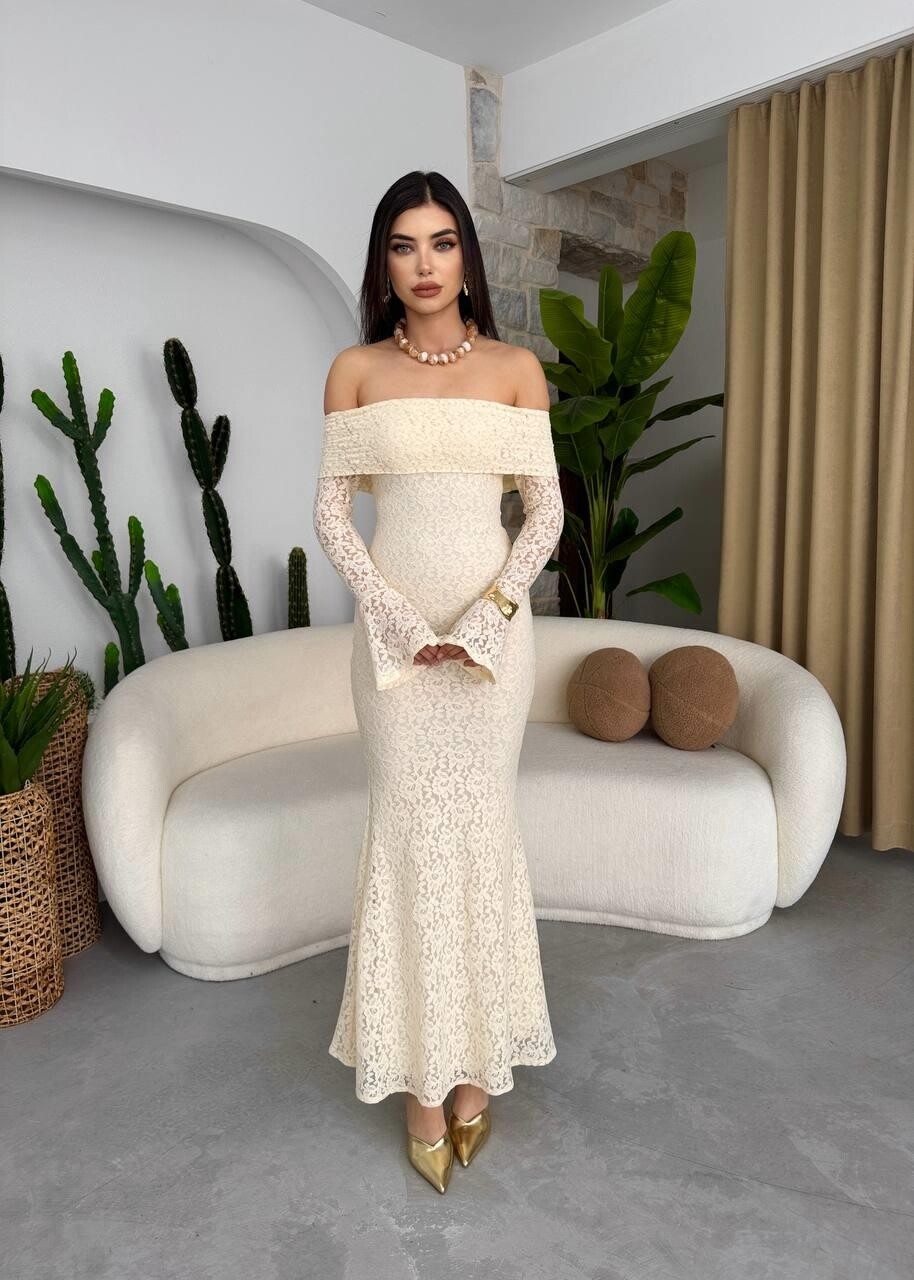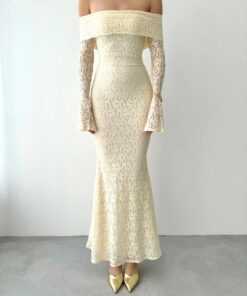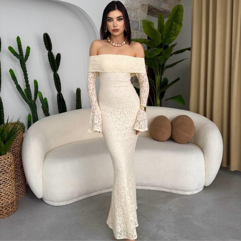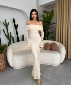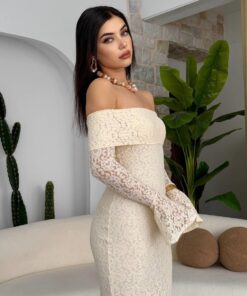 فستان أبيض بكتف مكشوف وتصميم ضيّق يُبرز القوام، مصنوع من دانتيل فاخر بأكمام طويلة متّسعة تضيف لمسة درامية أنثوية. مثالي للسهرات والمناسبات الخاصة بإطلالة جريئة وأنيقة.