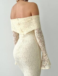 فستان أبيض بكتف مكشوف وتصميم ضيّق يُبرز القوام، مصنوع من دانتيل فاخر بأكمام طويلة متّسعة تضيف لمسة درامية أنثوية. مثالي للسهرات والمناسبات الخاصة بإطلالة جريئة وأنيقة.
