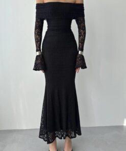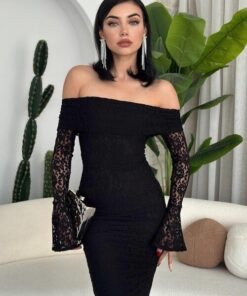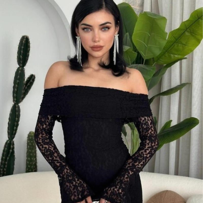 فستان أسود بكتف مكشوف وتصميم ضيّق يُبرز القوام، مصنوع من دانتيل فاخر بأكمام طويلة متّسعة تضيف لمسة درامية أنثوية. مثالي للسهرات والمناسبات الخاصة بإطلالة جريئة وأنيقة.