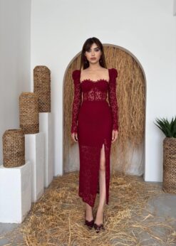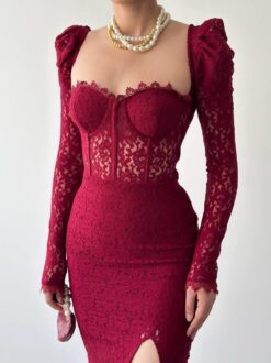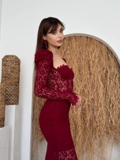 تميّزي بإطلالة فاخرة مع فستان سيينا الخمري المصنوع من قماش الدانتيل الفاخر والمصمم بتفاصيل أنثوية راقية. يأتي بقصّة كورسيه محددة للخصر وأكمام طويلة من الدانتيل الشفاف تضيف لمسة من الرقي الكلاسيكي.