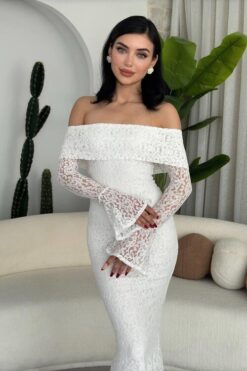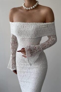 فستان أبيض بكتف مكشوف وتصميم ضيّق يُبرز القوام، مصنوع من دانتيل فاخر بأكمام طويلة متّسعة تضيف لمسة درامية أنثوية. مثالي للسهرات والمناسبات الخاصة بإطلالة جريئة وأنيقة.