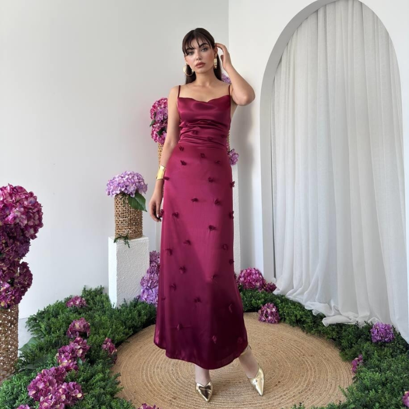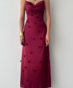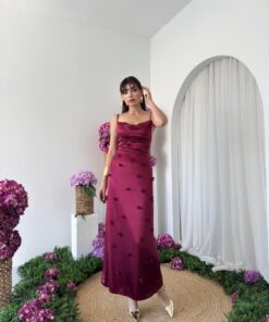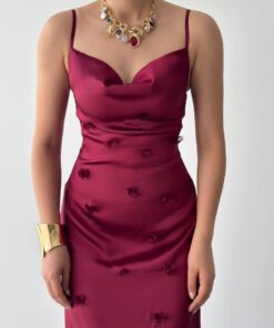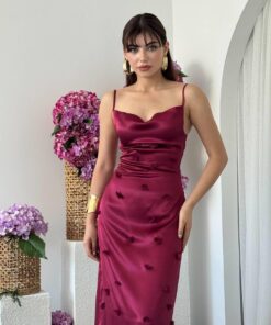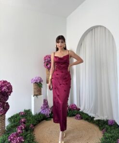ارتدي لمسة من السحر مع فستان “دورا” بلونه العنّابي الملكي وقماشه اللامع الفاخر.