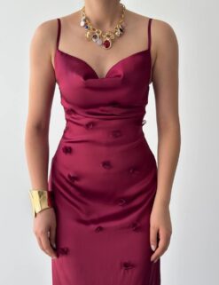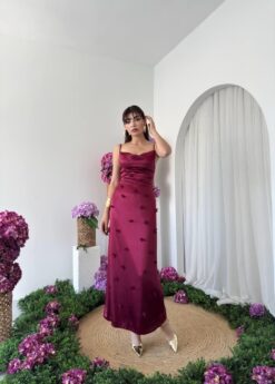 ارتدي لمسة من السحر مع فستان “دورا” بلونه العنّابي الملكي وقماشه اللامع الفاخر.