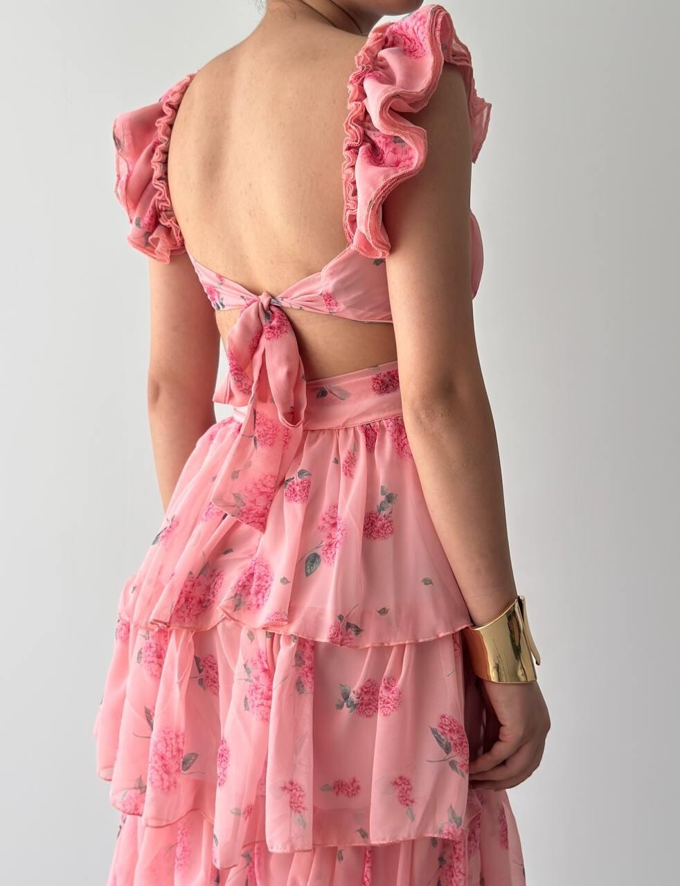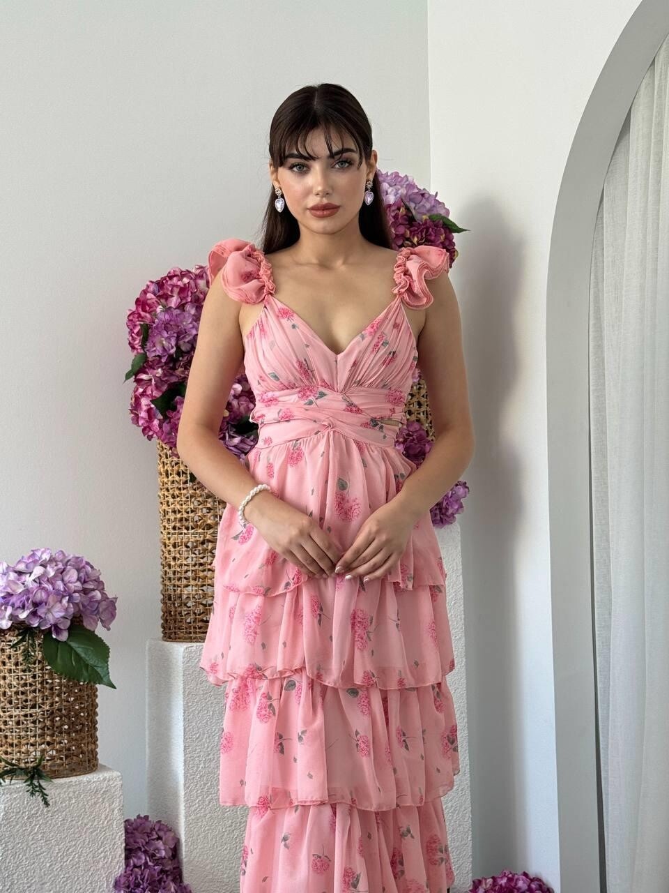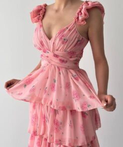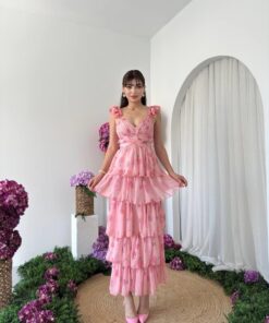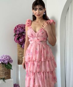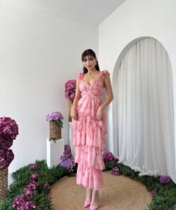 فستان وردي ساحر بتفاصيل كشكش متدرجة تمنحك حركة أنثوية جذابة. مصنوع من شيفون خفيف بنقشة زهرية ناعمة، مع حمالات مكشكشة وفتحة صدر أنثوية تُبرز جمال الإطلالة. مثالي لحفلات الخطوبة، الأعراس، أو المناسبات الصيفية الحالمة. يُضفي لمسة رومانسية حالمة لكل من ترتديه.