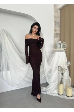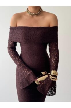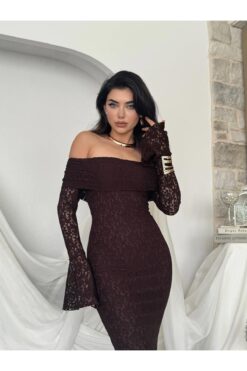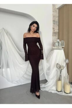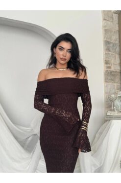 فستان بني بكتف مكشوف وتصميم ضيّق يُبرز القوام، مصنوع من دانتيل فاخر بأكمام طويلة متّسعة تضيف لمسة درامية أنثوية. مثالي للسهرات والمناسبات الخاصة بإطلالة جريئة وأنيقة.