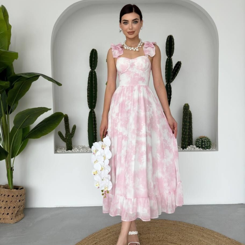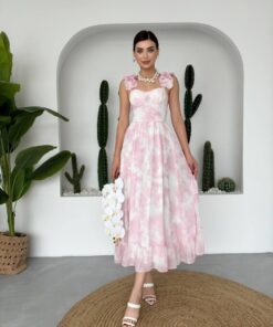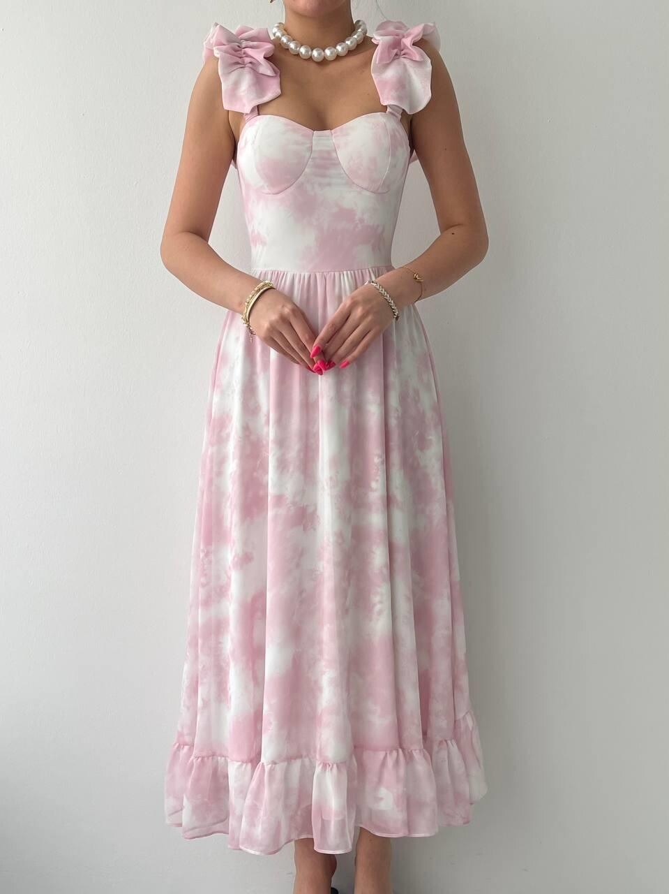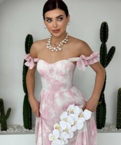 فستان وردي طويل مع فيونات على الكتفين🩷