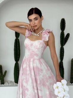 فستان وردي طويل مع فيونات على الكتفين🩷