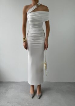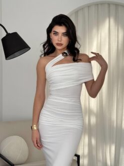 فستان بتصميم أنيق وعصري بكتف واحد متقاطع، يمنحك إطلالة استثنائية وأنثوية. مصنوع من قماش مطاطي ناعم بلون أبيض ، ينحت الجسم ويبرز تفاصيله بانسيابية ساحرة. الجزء العلوي مزين بثنيات دقيقة وسلسال ذهبي أنيق يضيف لمسة فخامة. مثالي للمناسبات الخاصة أو السهرات التي تحتاجين فيها للتميّز والتألق.🤍